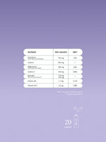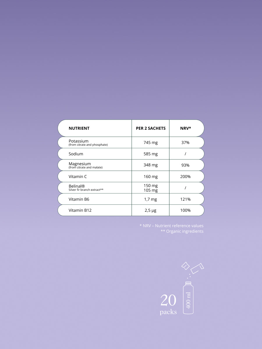 Regulator kiselosti (limunska kiselina), magnezijev citrat, natrijev klorid, kalijev citrat, monokalijev fosfat, magnezijev malat, bojila (koncentrat cikle (Beta vulgaris), ekstrakt ljubičaste borovnice), prirodne arome, vitamin C (L-askorbinska kiselina), Belinal® (ekstrakt srebrne jele (Abies alba)), zaslađivač (sukraloza), vitamin B6 (piridoksin hidroklorid), vitamin B12 (cijanokobalamin).