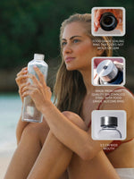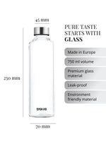 A premium glass bottle designed for sustainable, stylish hydration. Finished with a silver cap and paired with a grey faux leather sleeve for extra protection.